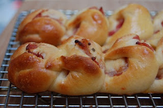 Simply, bacon and onion, cheese are folded with the dough, and shape it, bake it.